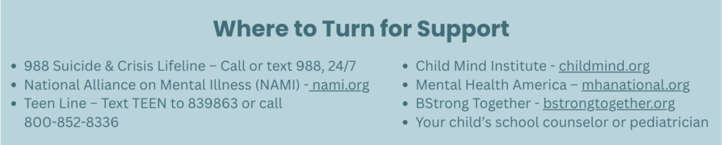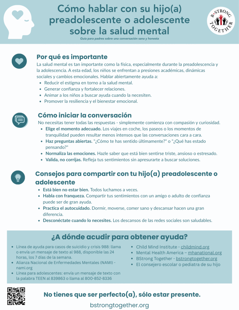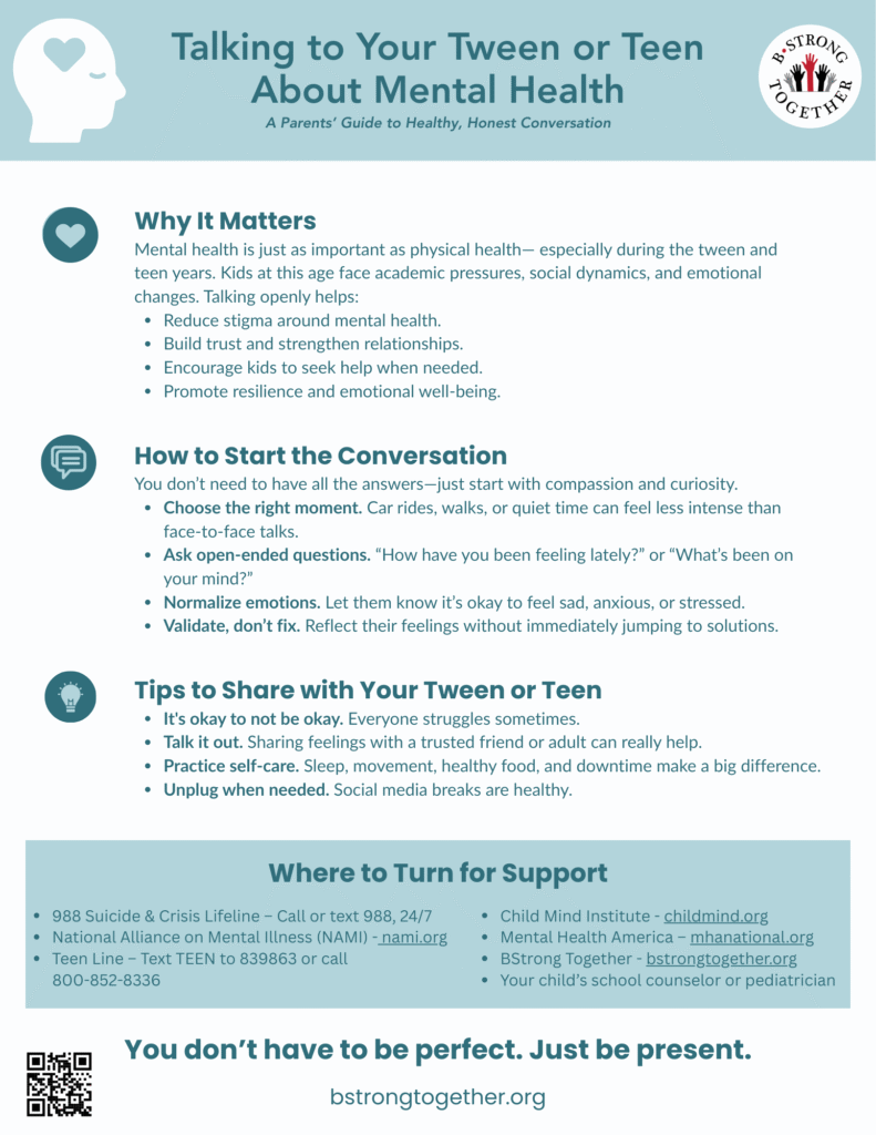 Mental health is just as important as physical health— especially during the tween and teen years. Kids at this age face academic pressures, social dynamics, and emotional changes. Talking openly helps: